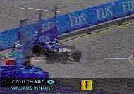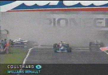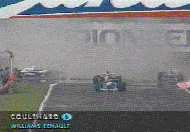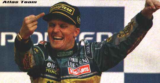 This in my mind was the most amazing moment in Formula One this year. David Coulthard lines up, in pole position, of what many people expect to be his debut Grand Prix win. On the warm-up lap he powers away confidently as he begins his lap. However as he gets to the Variante Ascari, he spins off into the sand trap. This is simply unheard of, while Prost spun off and retired at Imola in 1991 on the warm-up lap, that was in atrocious weather conditions. David later explained " there was a lot of oil left on the track from the previous Williams Renault Clio race". Strangely this kind of explanation sounds familiar of another British ex-formula one driver. On the Podium Johnny Herbert showed his delight of his second Grand Prix Victory, by promptly producing a finger to the crowd (shown at top of page). Perhaps he was expressing his gratitude to Flavio for providing an equal opportunity with Schumacher to win.